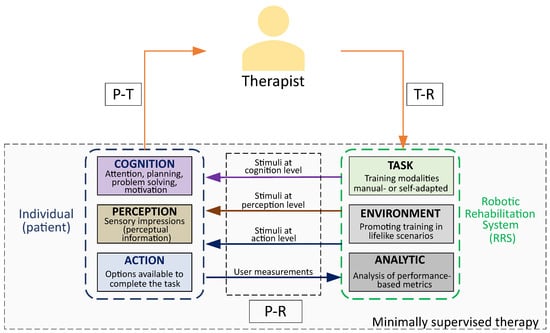 In the above-presented robot-aided framework, the three participants of the process can be appreciated: therapist, patient, and robotic device. Thereby, human–robot interaction can be considered from two perspectives: between therapist and robot (T-R) and between patient and robot (P-R). Enabling proper channels for such interactions is essential for increasing the effectiveness of therapy.