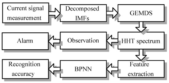 This paper first introduces the HHT and the proposed GEMD models, and then motors’ current signals of different types of bearing damages were measured and analyzed. The modular structure serves to detect the bearing damages as subjected to damaged bearings such as in Figure 1. EMD decomposes the measured current signals to a number of layers of IMFs, and then the optimal IMFs by using the proposed GEMD can be obtained. The HHT spectrum of the optimal IMFs transformed by HT can be used to observe the damage characteristics for the alarm system. Compared with the classical HHT method, the proposed GEMD model renders the current signal analysis as a refined HHT spectrum. Alternatively, the features of various damage types can be extracted from the HHT spectrums, and the superior recognition accuracy by using the BPNN model can be validated.