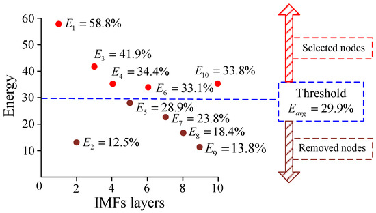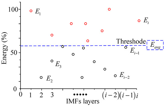 The energy of the i-th layer of IMFs comes from a recognition accuracy estimated by the BPNN, as shown in Figure 3. Average energy is calculated when it has each IMF energy of recognition, as shown in Equation (7), where is the number of IMF layers. Average energy is applied as the threshold to calculate the energy difference , as shown in Equation (8). When the of IMF is lower than of IMFs, which means is negative, those have to be removed to avoid fuzzy the HHT spectrum.