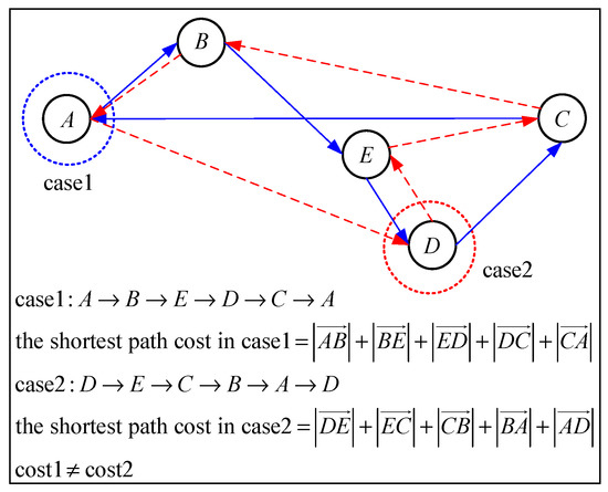 For example, assuming node A is the start node, the nearest node will be connected with node A, and the nearest node should be node B; the node distances are shown in Table 3. Then all remaining nodes should be sequentially connected to form a shortest close path, as shown in Figure 10. All the paths of the start nodes B, C, D, and E can be illustrated by repeating the aforementioned way, as shown in Figure 11, Figure 12, Figure 13 and Figure 14.