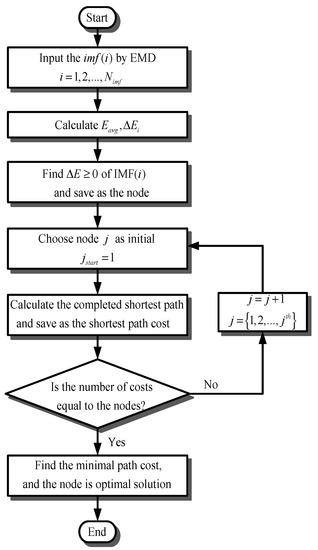 The j-th node in which each node is are selected in the i-th layer of IMFs. Each initial j-th node produces different shortest path costs, as shown in Figure 4. A first node is chosen to connect the other nodes to form its shortest path, and the corresponding/relative shortest path cost can be calculated. Every shortest path and its shortest path cost can be calculated to each first node. Consequently, the optimal first node can be obtained which is the minimal cost in the shortest path costs. The optimal first node is the best IMF layer to sufficiently represent characteristics of the signals. The flowchart of the GEMD model is shown as Figure 5.