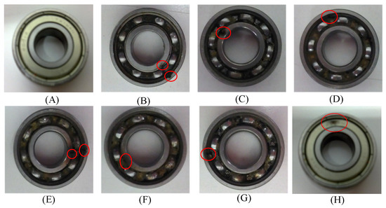(A) Healthy bearing, (B) 1.0 mm holes on both inner and outer race, (C) one 1.0 mm hole on inner race, (D) one 1.0 mm hole on outer race, (E) 0.5 mm holes on both inner and outer race, (F) one 0.5 mm hole on inner race, (G) one 0.5 mm hole on outer race, and (H) seal damage.