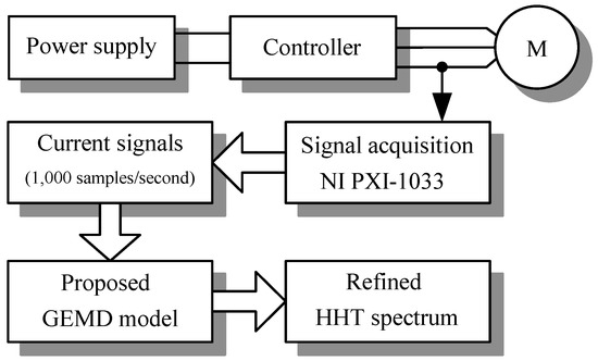 These current signals were recorded using National Instruments PXI-1033 data acquisition (sample rate 1,000 Hz, National Instruments, Austin, TX, USA.). The current signals were decomposed to layers of IMFs by EMD. Then the optimal IMFs, which were selected using the proposed GEMD model, were transformed by the HHT spectrum to observe the bearing damage condition. The detection system diagram is shown in Figure 7.