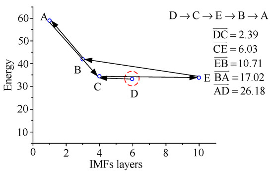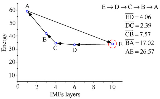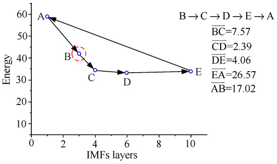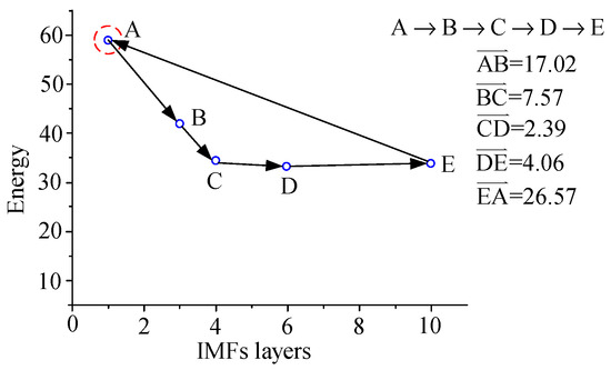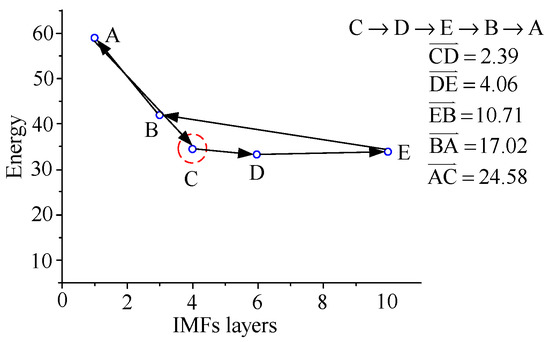 The costs of the all paths with A, B, C, D, and E as start nodes are shown in Equation (9), in which the lowest costs of the paths formed by the start nodes A, B, and E are obtained. That means the optimal IMF layers 1, 3, and 10 can adequately illustrate the HHT spectrum of the damage type.
