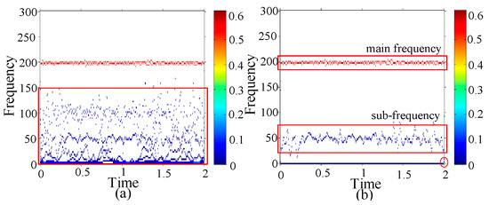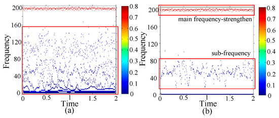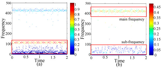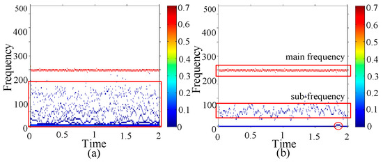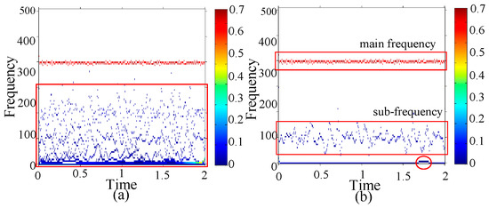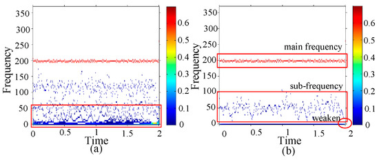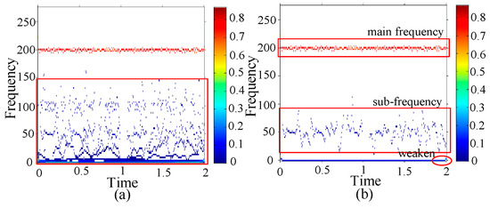The type of damage is with two 0.5 mm holes on both the inner and outer race. The HHT and GEMD-HHT spectrums of the damage are shown in Figure 17a,b, respectively, in which the main frequency bands are around 240–250 Hz. Observing the GEMD-HHT spectrums of the damage type, two specific damage characteristics are found: (1) the sub-frequency band is around 30–80 Hz, (2) the frequency of 1.8-th s is changed from 0 Hz to 5 Hz.