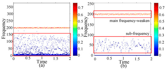 The type of damage is with one 1.0 mm hole on inner race. The HHT and GEMD-HHT spectrums of the damage are shown in Figure 21a,b, respectively, in which the main frequency bands are around 190–200 Hz. Observing the GEMD-HHT spectrum of the damage type, two specific damage characteristics are found: (1) the sub-frequency band is around 15–90 Hz, (2) the frequency of 2nd s changed from 0 Hz to 5 Hz, and its amplitude is weakened.