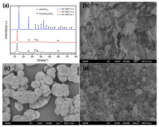 (a) XRD (Cu Kα, λ = 0.15406 nm) patterns and SEM (secondary electron imaging mode) images of as-prepared precursor obtained by different ratios of Ni2+/HMT (hexamethylenetetramine): (b) 2:1; (c) 1:2; and (d) 1:3.