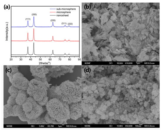 (a) XRD (Cu Kα, λ = 0.15406 nm) patterns and SEM images (secondary electron imaging mode) of as-prepared (b) nickel oxide (NiO) nanosheet; (c) NiO microsphere; and (d) NiO sub-microsphere.