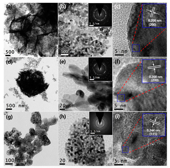 In order to further study the morphology and microstructure of the NiO samples, TEM, high-resolution TEM (HRTEM), and selected area electron diffraction (SAED) patterns were performed and the results are shown in Figure 3. It can be seen from Figure 3a that the NiO nanosheet sample was composed of an aggregation of nanosheets, in accordance with the SEM observation (Figure 2b). The nanosheets are composed of many grains with diameters of 30–50 nm, and a large number of holes are also observed (Figure 3b). The SAED pattern exhibits a typical polycrystalline ring, which indicates that the material has good crystallinity (inset in Figure 3b). The HRTEM image (Figure 3c) demonstrates clear crystal lattice fringes with lattice spacing of 0.208 nm, corresponding to the (200) crystal plane of the NiO phase. Figure 3d indicates that the NiO microsphere sample was composed of about 2 µm microspheres and some fragmented aggregates with the size of 500 nm which could be caused by the ultrasonic vibration during the TEM sample preparation process. Figure 3e shows that the microsphere consists of rod-like particles with a diameter of 20 nm and a length of 100 nm. The SAED pattern also indicates a typical polycrystalline ring (inset in Figure 3e). The clear lattice fringes observed in HRTEM images (Figure 3f) indicate the good crystallinity of the NiO microsphere sample. Figure 3g shows that there are many aggregations of sub-microspheres with a size of 100 nm in the NiO sub-microspheres. The high-magnification TEM image in Figure 3h indicates that the sub-microspheres are composed of many grains of 10–20 nm in size and a large number of well-distributed pores are observed. The SAED pattern is also a polycrystalline ring (inset in Figure 3h). The HRTEM image (Figure 3i) shows clear lattice fringes with a spacing of 0.244 nm, which can be attributed to the (111) crystal plane of the NiO phase. The corresponding energy dispersive spectroscopy (EDS) spectra (Figure S1) indicates that the atomic ratio of Ni and O in the samples are close to 1:1.
