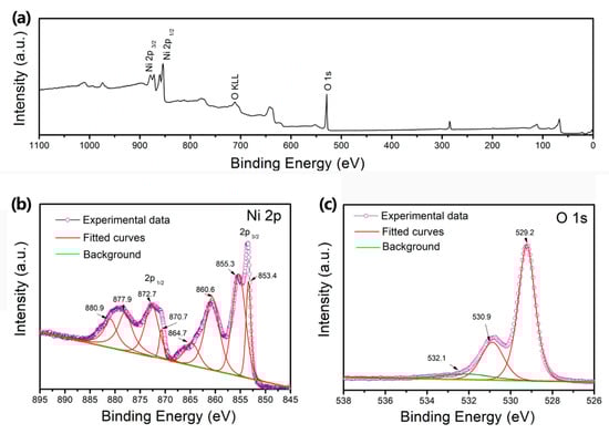 To study the element composition and valence state of NiO sub-microsphere sample, XPS technique was performed (Figure 4). From the survey spectrum (Figure 4a), it can be seen that the binding energy peaks of Ni and O atoms exist in the spectrum. Figure 4b shows the Ni 2p binding energy spectrum. There are eight fitted binding energy peaks in the range of 850-885 ev. Among them, the two peaks located at 853.4 and 855.3 eV correspond to the characteristic peaks of Ni 2p 3/2, and the two peaks around 870.7 and 872.7 eV correspond to the Ni 2p 1/2 peak. The doublet peaks of 853.4 and 870.7 eV are related with Ni2+ component, and the peaks of 855.3 and 872.7 eV are ascribed to Ni3+ component [25]. The remaining four characteristic peaks at 860.6, 864.7, 877.9, and 880.9 eV are satellite peaks. Figure 4c shows the O1s binding energy spectrum. It can be fitted to three characteristic peaks of 529.2, 530.9, and 532.1 eV, which correspond to Ni-O bond, oxygen in OH− groups, and adsorbed water on the surface of the sample, respectively. These results indicate the formation of NiO phase, which is consistent with XRD results.