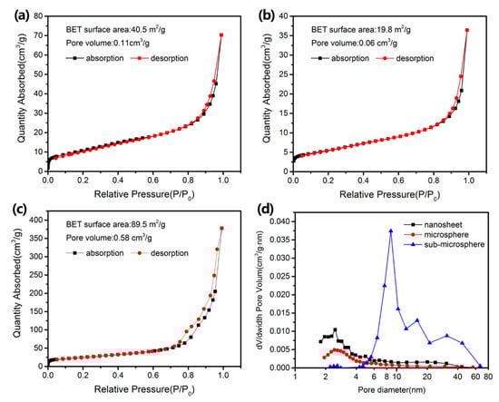 (a) N2 adsorption–desorption isotherm curves of NiO nanosheet; (b) N2 adsorption–desorption isotherm curves of NiO microsphere; (c) N2 adsorption–desorption isotherm curves of NiO sub-microsphere; and (d) pore size distribution derived from the adsorption branches of the isotherm data of the as-prepared NiO nanostructures.
