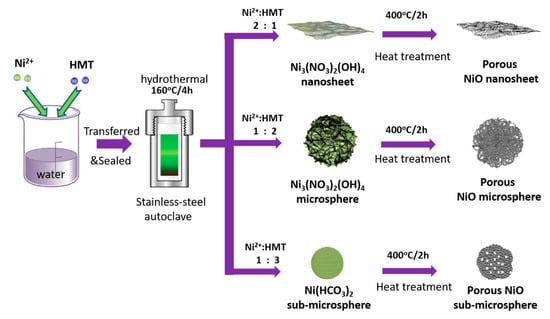 The precursor was prepared by the hydrothermal method which can transform to NiO by subsequent calcination. In the experiments, nickel chloride hexahydrate puratrem (Cl2H12NiO6, Sinopharm Chemical Reagent Co., Ltd., Shanghai, China) and HMT (C6H12N4, Sinopharm Chemical Reagent Co., Ltd., Shanghai, China) were used as raw materials, and deionized water as reaction solvent. The experimental process was as follows: Cl2H12NiO6 was firstly dissolved in deionized water to get 0.2 M Ni2+ solution, and then HMT was added the solution under stirring to obtain the mixed solution. The mixed solution was then transferred to the stainless-steel autoclave at 160 °C for 4 h to obtain the precursor product. Among them, the molar ratios of Ni2+/HMT were 2:1, 1:2, and 1:3 for the synthesis of nickel oxide precursor nanosheets, microspheres, and sub-microspheres, respectively. After being cleaned and dried, the as-prepared precursors were put into a high-temperature furnace and calcined at 400 °C for 2 h at a heating rate of 2 °C/min. Finally, mesoporous NiO hierarchical nanomaterials with multi-morphologies were obtained.