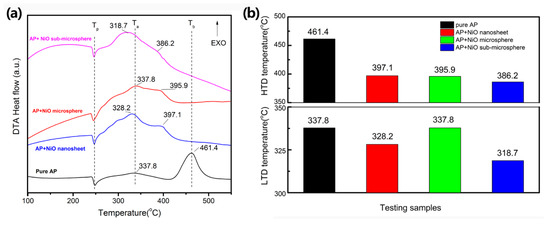 (a) Differential thermal analyzer (DTA) curves of pure ammonium perchlorate (AP) and AP mixture with as-prepared NiO additives; (b) histogram of high temperature decomposition (HTD) and low temperature decomposition (LTD) temperatures in (a).