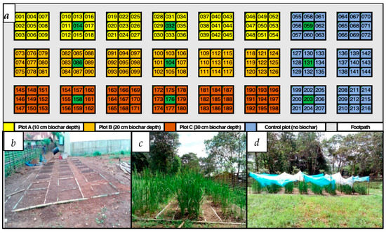 Figure 3a,b). Tillering was not completely consistent with biochar application depth, probably due to field contingencies (pest damage and water logging) under the tropical rainfed condition.