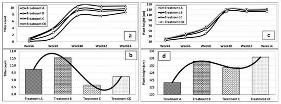 Figure 3c plots the measured plant growth from the 4th to the 14th week after planting. Similar to tillering, growth was rapid until the 10th week and almost stagnated until the 14th week. Unlike tillering, however, growth was strongest in CK (132.96 cm), followed by TB (131.56 cm), TC (129.30 cm) and then TA (124.19 cm) in that order (