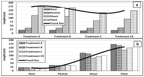 Figure 4). However, plant length under CK (no biochar) was higher than that under TC (30 cm biochar depth). On average, the rice plant increased from root to panicle (cut from the last leaf base) and then to shoot (without panicle). Genetically, rice shoot is longest, followed by panicle and then root (