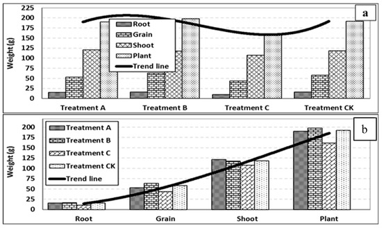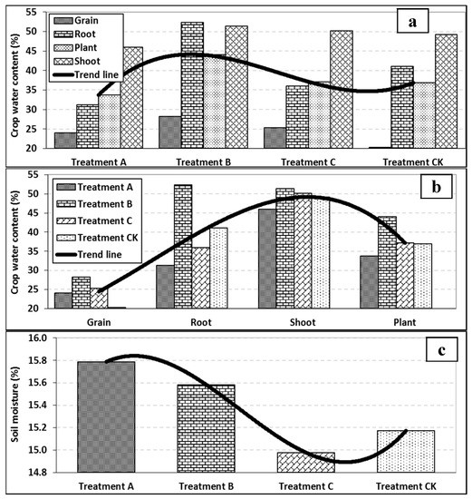 Figure 6b), it was highest for shoot (49.18%), followed by root (40.18%), the whole plant (37.94%), and then the grain (24.47%). Then for soil moisture content across the treatments (