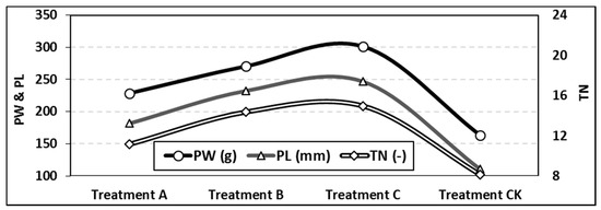 Figure 4a is the sum of all the measured yield components, and that (which is the same as the value for plant length) in the bottom plate is the average across the treatments. From the plot, it was clear that with root length added, TA had the highest productivity in terms of plant length (172.90 cm). This was followed by TB, CK, and then TC had the shortest length (134.48). Generally, root length decreased with increasing biochar application depth, and root length under CK was higher than that under TC (the 30 cm biochar depth treatment). Also along the yield components, TA performed the best and TC the worst (