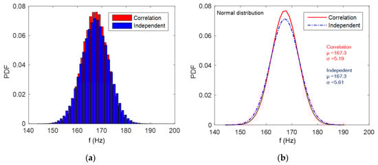 Probabilistic distribution of first order frequency of Laminate 1 by considering correlated and independent meso-scale random variables: (a) histogram; (b) fitted by normal distribution.