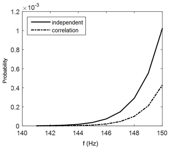 Figure 2 shows histogram and probability distribution of the first order natural frequency of Laminate 1 derived from ‘independent meso-scale uncertainty’ and ‘correlated meso-scale uncertainty’. From the histogram shown in Figure 2a, it is shown that the ‘correlated meso-scale uncertainty’ provides more samples at the middle region and less samples at the tail region. By Kolmogorov–Smirnov and Anderson–Darling tests, the probability distribution of the first order natural frequency tended to follow normal distribution. From the fitted probability density function by normal distribution as shown in Figure 2b, it is seen that there is notable difference in the tail region between the two probability density functions. The cumulative probability of the first order natural frequency is shown in Figure 3, which shows that the ‘independent meso-scale uncertainty’ provides a notable overestimation on the cumulative probability. This demonstrates a necessity to account for statistical correlation between meso-scale uncertainty to derive accurate stochastic natural frequency.