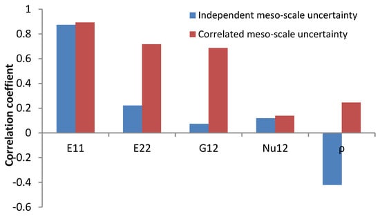 To achieve better understanding on the contribution of different uncertainty to the stochastic variation of the natural frequency, linear correlation coefficients between the first order natural frequency of Laminate 1 and meso-scale random variables were derived, as shown in Figure 4. The linear correlation coefficient reflected a stochastic dependence or sensitivity of stochastic variation of the natural frequency over input random variables. It is seen that neglecting correlation between meso-scale uncertainty suppressed the stochastic dependence on E22 and G12, which was similar to observation in [] where stochastic deflection of a laminate structure was investigated. An interesting observation is on the dependence over laminate density. If the statistical correlation between the meso-scale input random variables was ignored, the stochastic dependence of the first order natural frequency over ply density was negative. It seems to be under expectation as it is known that larger density results into smaller natural frequency if plate stiffness and boundary conditions remain unchanged. However, from a multi-scale viewpoint, the ply density is actually positively correlated with ply modulus, and a larger ply density also indicates a larger stiffness. Hence, for the case of ‘correlated meso-scale uncertainty’, a positive correlation was seen between the natural frequency and the ply density. This highlights the importance to consider statistical correlation between meso-scale mechanical properties to achieve comprehensive understanding on the stochastic free vibration of laminate plates.