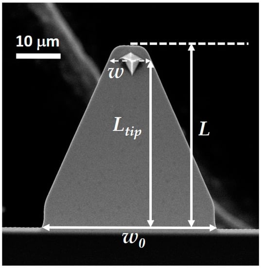 | AFM Probe | Spring Constant, ktip (N/m) | w0 (μm) | w (μm) | w/w0 | Ltip (μm) | L (μm) | t (μm) | D (μm) | D/Ltip | Tbeam | Ttri | Ttrap. | K |