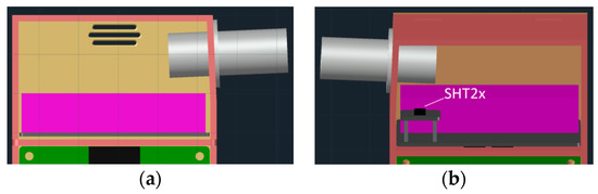 Drawing of the designed gas chamber as a dedicated compartment in the device housing (in salmon). View of the mouthpiece (in light gray) and ventilation grate (in beige) (a). The SHT21 is soldered to a raised daughter board (in dark gray) allowing for indirect airflow as well as thermal separation from the gas sensor array (in violet) printed circuit boards (PCB) (b).