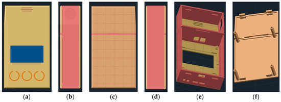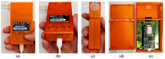 3D view and projections of the developed housing for the portable gas analyzer designed using CAD software. The housing is comprised of two parts: a front piece with user interface elements (a), mouthpice port (b), USB port and μSD card slots and back panels (c,d) allowing easy assembly (clips and slots) and access inside the device (e,f). Total dimensions are 95.2 mm × 23.7 mm × 51.6 mm.