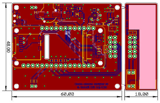 The designed device provides three main functionalities: signals measurement; data analysis; and communication and interaction with the user and data presentation. Control electronics were designed accordingly to provide appropriate hardware resources. As discussed earlier, the device’s housing needed to be divided into two compartments: one is the gas chamber and the other accommodates the control electronics. Therefore, two separate PCBs were designed, the layout of both are shown in Figure 3. The sensor array PCB located in the gas chamber hosts all the sensors for which heater supply, circuit supply, and signal outputs are routed via a pin header connector to the motherboard PCB located in the second compartment, which contains the control electronics of the analyzer. The header pinout is described in Table 1.