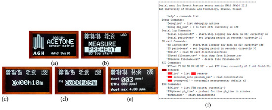 User interface screens of the developed portable gas analyzer. Splash screen (a), main menu (b), preheat setting (c), and executing (d) measurement screen presenting the acetone concentration and the raw data from each sensor (e). Alternatively, the analyzer can be controlled through a serial interface (f).