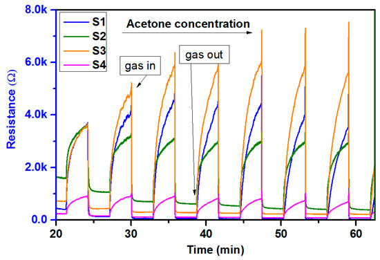 Despite the S1 sensor being the one dedicated for acetone sensing due to its high sensitivity, there were others acting in a similar fashion. Figure 7 shows the gas-sensing responses of sensor S3, which was non-dedicated to acetone detection, however, as can be observed under exposure to acetone, it reacted with resistance changes. This cross-sensitivity effect is a disadvantage of metal-oxide based sensors and has to be taken into account within the firmware.