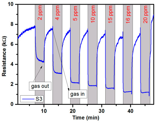 The resistance changes of sensor S3 (non-dedicated to acetone detection) in a gas sensor array under exposure to 2–20 ppm of acetone. Optimal operating temperature (given by the manufacturer) was ensured and 50% relative humidity was stabilized.