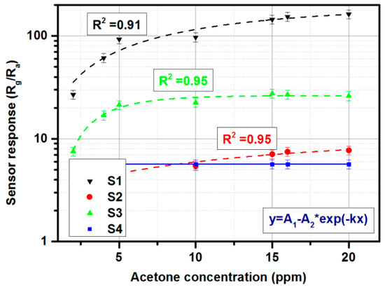 The calibration curves of all four sensors (S1–S4) in the gas sensor array under exposure to 2–20 ppm of acetone. Optimal operating temperature (given by the manufacturer) was ensured and 50% relative humidity was stabilized.