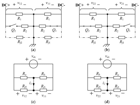 The unbalanced electric bridge DC-IM topology circuit is shown in Figure 1, where vdc is the DC voltage; Rf2 and Rf1 are the positive and negative insulation resistances, respectively; Ra and Rb are the bridge resistances, Ra = R1, Rb = R1||R2, so Ra > Rb. The unbalanced electric bridge method works in two phases, namely, M1 and M2. In the M1 phase, Q1 turn-on and Q2 turn-off, the positive half-bridge resistance is Ra, the negative half-bridge resistance is Rb, the negative and positive half-bridge voltages are v11 and v12, respectively, and the ground current is i1, as shown in Figure 1a. In the M2 phase, Q1 turn-off and Q2 turn-on, the positive half-bridge resistance is Rb, and the negative half-bridge resistance is Ra. The negative and positive half-bridge voltages are v21 and v22, respectively, and the ground current is i2, as shown in Figure 1b. The conventional DC-IM method can be expressed as Equation (1) by Kirchhoff’s law.