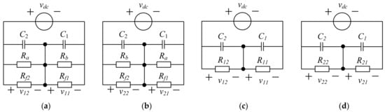 When the DC system has GC, the capacitance value of the DC negative pole to the earth is C1, and the capacitance value of the DC positive pole to the earth is C2. Thus, the circuits in Figure 1c,d can be changed to those shown in Figure 2a,b. To facilitate calculation and analysis, the equivalent resistance of the two working modes is assumed to be what is shown in Equation (2). Figure 2a,b can be simplified as Figure 2c,d.