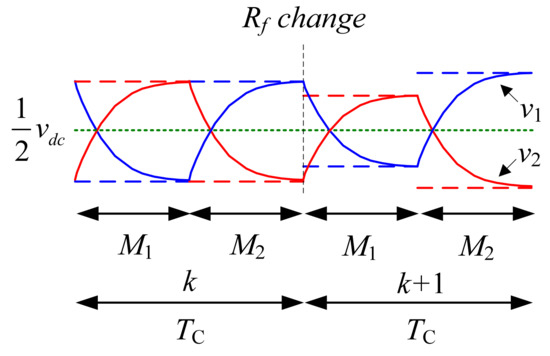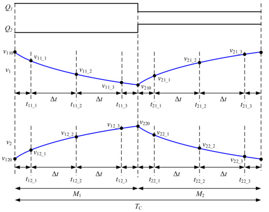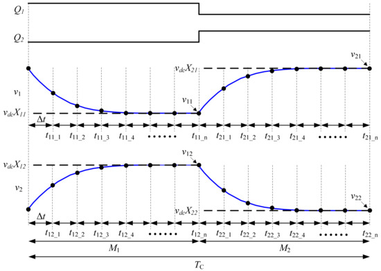 When the two phases switch with each other, the charging process of GC belongs to the first-order circuit full response process, and the curvilinear function Equation (5) can be obtained, where v110, v120, v210, and v220 are the initial voltage of the full response processes of v11, v12, v21, and v22, respectively.