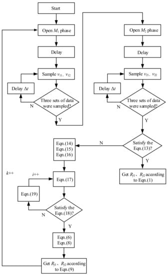The actual sampled voltage value shows a certain deviation from the expected value. The red sampled point in Figure 6 shows that the exponential function curve cannot be formed. The result calculated by the sampled value must be a large error. Therefore, to obtain satisfactory results, the sampled values must be corrected with a loop iterative correction method. ,,,,,,,,,,, and are set as the ith correction voltage values. After the 12 voltages of v11, v12, v21, and v22 are sampled completely, the counter is set as i = 0. The 12 voltage values are substituted into the following equation, and the sampled value is used as the initial correction value.