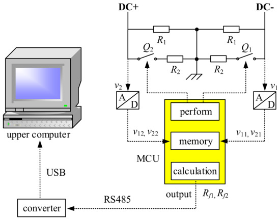 With the increasing popularity of electric vehicles (EVs), strict requirements are being established for the driving and charging safety of EVs. The insulation of EVs decreases due to rain, dampness, collision, and other reasons arising from the long-term exposure of EVs and charging equipment to the outdoor environment [1,2]. The DC system of EVs is connected to numerous power electronic devices, including the motor converter, battery charger, air conditioner, and DC–DC converter [3], and the overall connections may form a DC power microgrid system when EV is charging [4,5]. Insulation failure of any equipment affects the safety of the entire system. When the insulation resistance of the system decreases to below a threshold value, the vehicle sends warning signals. If the situation is serious, then the high-voltage system must be cut off and stopped for troubleshooting [6,7]. The DC insulation monitoring (DC-IM) function is thus required before charging by the DC charging pile and during the process of driving the EVs [8]. Various insulation-monitoring devices and embedded circuits have been designed and installed in DC charging piles, battery packs, high-voltage distribution boxes, and other equipment or embedded in the battery management system of EVs. DC-IM methods include balanced electric bridge [9], unbalanced electric bridge [10,11,12,13,14], high-voltage injection [15], differential amplification [16], and low-frequency small-signal injection [17,18]. The unbalanced electric bridge method can synchronously monitor positive and negative insulation resistances, has a low cost, and is easy to realize; thus, it has been widely used in EVs and charging piles.