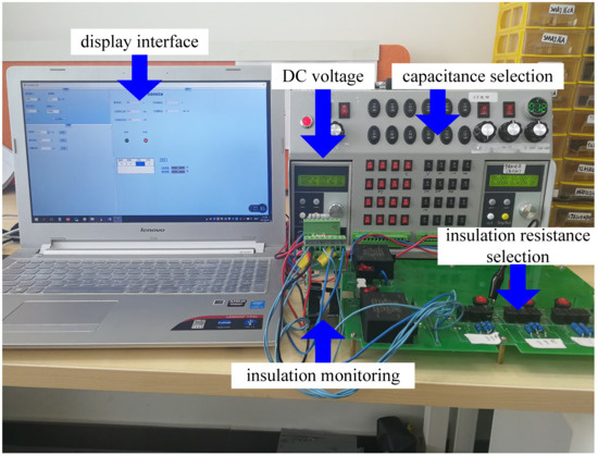 The DC-IM device with the unbalanced electric bridge method is created, and the schematic overview of application is shown in Figure 8. The MCU performs the switch Q1 and Q2, sample the voltage values of v1 and v2 stored in memory, then calculate the Rf1 and Rf2, and output the result to the computer. The experiment table is shown in Figure 9. It includes the display interface, DC-IM device, voltage regulating device, insulation resistance selection switch, and GC selection switch. The DC-IM controller uses a PIC18F4580 single-chip microcomputer. The monitoring period is 0.2 s; that is, the switch action occurs every 0.1 s, so the sampling time should satisfy (t1 + 2Δt) < 0.1 s. The positive grounding resistance is Rf1 = 1000 kΩ, the negative grounding resistance is Rf2 = 300 kΩ, the first sampling time t1 = 0.01 s, the bridge resistance is Ra = 1000 kΩ, and Rb = 200 kΩ. The GC value is CY = C1 = C2. The grounding current waveform corresponding to different GCs is shown in Figure 10. The waveform of CY = 0.1 μF can be stabilized in a half cycle. The larger the value of CY is, the closer the waveform is to the triangle wave. Therefore, the traditional unbalanced bridge sampling method is used when CY < 0.1 μF, and the three-point climbing algorithm is used when CY > 0.1 μF.