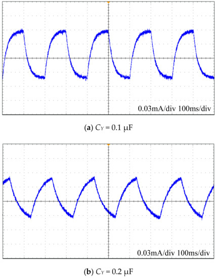 Waveform of grounding current with different values of CY. (a) CY = 0.1 μF. (b) CY = 0.2 μ. (c) CY = 0.4 μF.