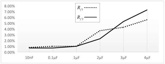 Different parameters are applied in the proposed method. (1) DC voltage vdc = 800 V, GC value CY = 0.1 μF, and the sampling time interval Δt is changed; the results are shown in Figure 11. The larger the sampling time interval is, the higher accuracy is. (2) DC voltage vdc = 800 V, sampling time interval Δt = 0.04 s, and the value of CY is changed; the results are shown in Figure 12. The smaller CY is, the higher accuracy is. (3) Sampling interval Δt = 0.04 s, CY = 0.1 μF, and DC voltage vdc is changed; the results are shown in Figure 13. The larger the DC voltage is, the higher accuracy is. When the DC voltage drops to below 200 V, the measurement accuracy is greatly reduced. (4) Under the premise that the parallel value of bridge resistance Ra || Rb is constant and the difference between Ra and Rb is changed; the results are shown in Table 2. The larger the difference between Ra and Rb is, the higher accuracy is. Time interval Δt increases, CY decreases, DC voltage vdc increases, and the difference between Ra and Rb increases. These factors make the sampled voltage difference larger, which will reduce the error of the final results.