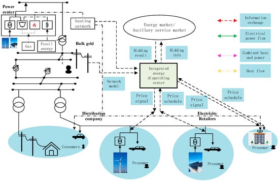 The system described in this paper, as shown in Figure 1, is mainly composed of the following subsystems: (1) Thermal system: it is composed of a thermal pipe network, which is connected with CCHP (Combined Cooling, Heating and Power) units, photovoltaic-thermal units, boilers and heat storage devices to realize the unified collection and deployment of heat energy. (2) Electric system: the electric system can connect various generator units and power conversion devices to realize the transmission, collection, distribution and consumption of electric energy, it can also realize the conversion of electric energy and other types of energy through various conversion devices. (3) The interaction between thermal and power systems: regenerative electric boilers are widely used in accommodation of renewable energy, peak load regulation of thermal power units and replacement of heating energy due to their good electric heat transfer efficiency and flexible running time. Figure 1 shows the multi-energy coordination system architecture of the urban power grid. The power grid dispatching center serves as the information transfer station for producers and consumers, distribution companies, power energy market, and auxiliary energy market, providing information services, including electricity price information, power plans, and so on. It is linked with several related subjects, making them relate to each other, ensuring the economic, safe and stable operation of the power grid, and allowing the subjects to make independent decisions, in case the decisions of one party or several parties affect the overall situation.
