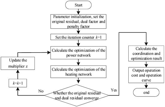 Flow chart of a solving multi-energy coordination problem based on the alternating direction multiplier algorithm.