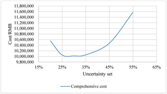 First, the optimal uncertainty set is rediscovered. It can be seen from Figure 6 that the proportion of the optimal uncertainty set is between 25% and 35% when the new energy penetration increases. The optimal uncertainty set, as shown in Table 3, is determined by binary search.