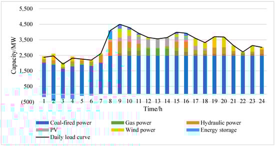 Considering the fluctuation of renewable energy, in order to increase the consumption capacity of the power grid for distributed energy and reduce wind/light curtailment, the energy storage device with a capacity of 500 MW is introduced on the original system. The output of various types of energy is shown in Figure 7.