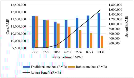 In this case, based on the initial calculation example (penetrance 18.4%, water volume 2533 MW∙h), the water limit was expanded to 10,131 MW∙h, and the ratio of hydropower output was increased to observe the benefit change of the robust method.