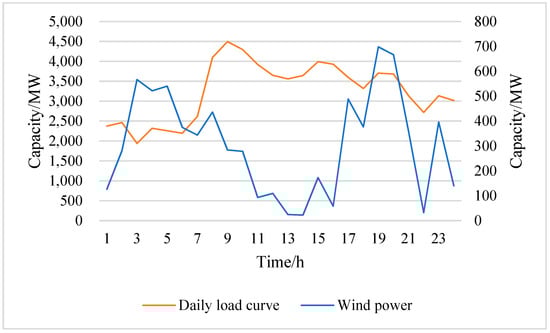 In the coordinated operation of the power system with large-scale intermittent renewable energy generators, the inherent uncertainty of renewable energy cannot be eliminated, which means other power sources have to make up for it [,]. When the intermittent power supply with a high proportion is suddenly increased or absent, the operating cost and efficiency of other units will be affected [,]. Under the current development of a new energy power situation, it is generally believed that renewable energy should be prioritized during system operation. Due to its good adjustability, the hydropower can balance the random fluctuation of intermittent energy power and undertake the task of peak shifting and valley filling, and the residual capacity bears part of the load. Conventional thermal power generating units should avoid frequent output adjustment (daily generation scheme does not consider start–stop) and maintain high efficiency of power generation. The energy storage device is charged at the load trough period and discharged at the load peak period and when the load increases sharply []. Heat pump, heat storage boiler and other devices can also achieve the regulation of electricity through heat storage []. Different from the traditional method of simply increasing the rotary reserve capacity to absorb the fluctuation of new energy, the method proposed in this paper will make full use of the regulating capacity of adjustable generator set and heat storage equipment to absorb the fluctuation of renewable new energy, and meet the robustness requirements of various extreme scenarios through reasonable resource allocation.