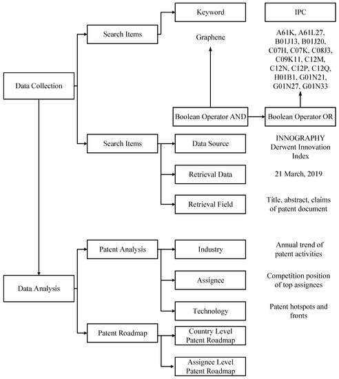 Collecting accurate data for patent analysis and patent roadmaps plays a crucial role in exploring TC. After reading the existing literature as well as consulting technical experts’ advice, we carry out an appropriate patent retrieval query and obtain patent information from the INNOGRAPHY platform, as well as the Derwent Innovation Index (DII) platform, which are professional intellectual property databases. In Figure 1, data analysis is shown to constitute two steps. First, regarding patent analysis, this study attempts to identify TC from the perspectives of industry, assignee, and technology. Taking into account data accessibility, we attempt to use the following patent indicators to conduct patent analysis, and identify TC in graphene biomedical technology: the annual trend of patent activities, competition position of top assignees, and patent hotspots and fronts. The analysis of annual distributions or dynamic changes of the number of patents appeared to be very useful for assisting stakeholders realize development trends and TC of specific industrial domain [53]. Based on patent analysis, analyzing the assignees would identify the key actors and competitors of the technological innovation in a given technological field. To be more specific, the competitive position is of fundamental importance to help assignees obtain information about competitive status quo and competitive advantages in TC [54]. The technological hotspots and fronts can be straightforwardly identified by using text clustering analysis, which helps people identify TC from the technology dimension [32]. Second, the proposed patent roadmap aims to mine technology opportunities that can be carried out by the following steps. First, in the proposed country level patent roadmap and assignee level roadmap, the horizontal axis indicates time-line, and the vertical axis represents technological fields namely the Derwent Manual Code (MC). Second, in the country level patent roadmap, a single node shows a country holding a high value patent, while in the assignee level patent roadmap, a single node represents a top assignee. We employ different colors to represent different countries. Finally, we build the patent roadmap by using the above indicators.
