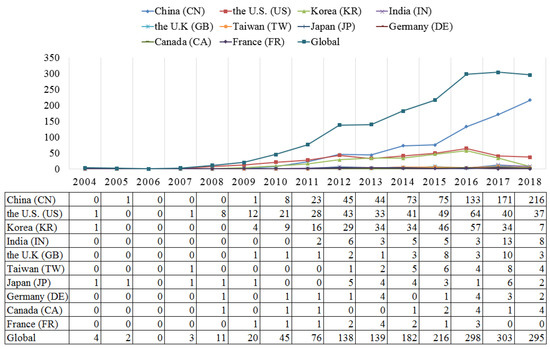 Investigating the TC of graphene biomedical technology through patent analysis and patent roadmap is the principle purpose of this paper. The collection process of patent data is the essential basis for patent analysis, as well as patent roadmaps. Patent data were retrieved from two professional intellectual property databases, namely INNOGRAPHY [55], and the Derwent Innovation Index (DII) [56]. In order to better improve the accuracy and relevancy of our patent data, the first effort is to construct a systematic patent retrieval query. The concept of “graphene” was based on the definition given by The International Union of Pure and Applied Chemistry (IUPAC) who regarded “graphene” as “a single carbon layer of the graphite structure” [57]. According to previous research, “graphene” can be used as a patent search string in patent queries [15,58]. By looking through relevant literature and consulting technical experts’ advice, we employed a broader criterion for retrieving patents in a given technological field. Patent data seems to be valid if the term “graphene” appears simultaneously in the “title or abstract or claims” of patent data. In addition, we followed advice from technical experts in graphene biomedical technology, and adopted technological fields represented by the international patent classification (IPC) to refine the retrieval query and retrieve graphene patents in the biomedical field. Finally, our patent retrieval query for graphene biomedical technology was composed by combining the keywords with patent classifications, using the “AND” operator. For the graphene biomedical technology case, the following patent retrieval query in INNOGRAOHY is displayed below. @(abstract, claims, title)("graphene")@* and ((ipc_A61K OR ipc_A61L27 OR ipc_B01J13 OR ipc_B01J20 OR ipc_C07H OR ipc_C07K OR ipc_C08J3 OR ipc_C09K11 OR ipc_C12M OR ipc_C12N OR ipc_C12P OR ipc_C12Q OR ipc_H01B1 OR ipc_G01N21 OR ipc_G01N27 OR ipc_G01N33)). In addition, we downloaded patent data in the field of graphene biomedical technology from DII based on the same retrieval strategy and query as that in INNOGRAPHY. Due to a relatively small number of patents before 2004, we retrieved patents filed from the year of 2004 to 2018 for analysis. We completed the data extraction on March 21, 2019. However, due to the 18-month lag period of patents, the number of patents in both 2017 and 2018 are incomplete, but without impacting the analysis of TC.