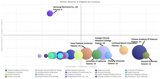 The INNOGRAPHY platform’s patent map is a powerful visualization software that enables stakeholders to understand how a particular market or technology stacks up and explores a competitive landscape among top assignees. By also integrating multiple data dimensions (e.g., litigation, product and technology standards) into a single view, the INNOGRAPHY platforms’s patent map enhances the ability to understand the TC of competitors, helping discovery of new competitors and opportunities. Three dimensions’ values (e.g., revenue, litigation, and locations) related to company resources are summed and plotted on the vertical axis, while three other dimensions’ values (e.g., patents, classifications, and citations) related to patent strength are summed and plotted on the horizontal axis. The higher score on the vertical axis indicates that assignees would have a greater ability to obtain resources, while the higher score on the horizontal axis indicates that assignees would also have a greater competitive strength on patenting activities. Therefore, the INNOGRAPHY platform’s patent map is designed to give an overview on competitive position of top assignees in a given technology field. We employ the INNOGRAPHY platform’s patent map to find the top assignees of TC in the field of graphene biomedical technology (see Figure 3).